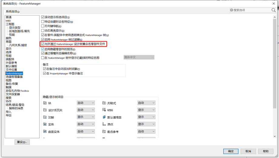 解决方法:勾选“系统选项-FeatureManager-允许通过FeatureManager设计树重命名零部件文件”。